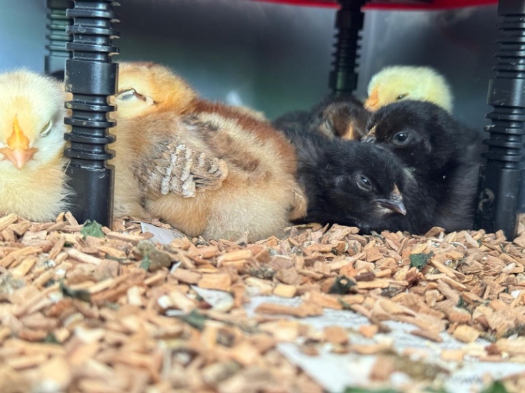 Nach 24 Stunden durften die Küken in ihren Käfig umziehen, der liebevoll – und natürlich mit einer Wärmelampe ausgestattet – eingerichtet worden war.