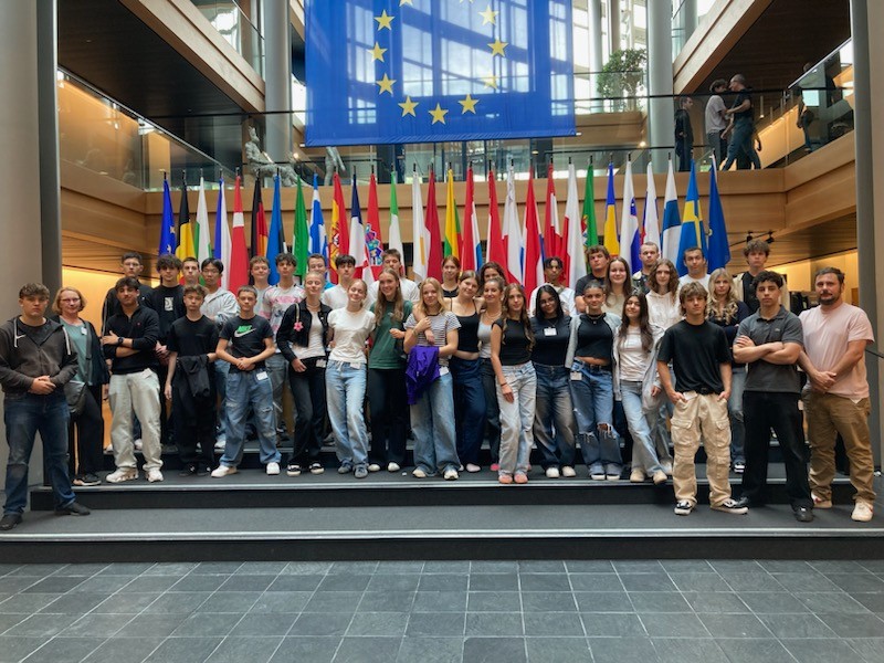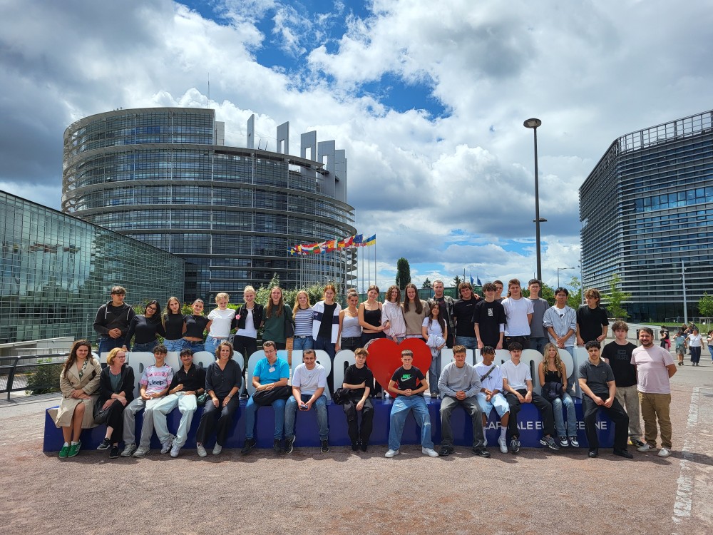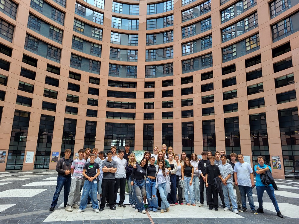 Am 22.07.25 unternahmen die Klassenstufen 9 einen Ausflug zum Europäischen Parlament in Straßburg, Frankreich. Nach einer zweistündigen Busfahrt erreichten wir das Parlamentsgebäude. Bevor wir jedoch hineindurften, mussten wir eine Sicherheitskontrolle durchlaufen. Zuerst zeigten wir dem Security am Eingang unsere Ausweise vor und unsere Jacken und Taschen wurden, ähnlich wie am Flughafen, durch einen Scanner überprüft. Anschließend erhielten wir Namensschilder mit unseren Namen.